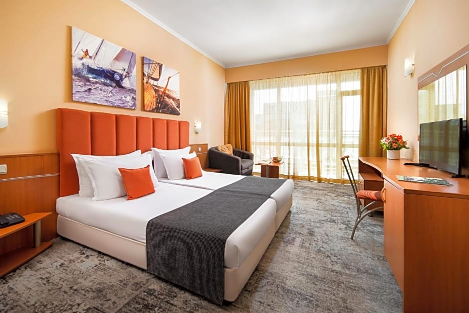 This twin room has a beautiful sea view, a balcony with outdoor furnishings and air conditioning. A TV, a safety deposit box and a small refrigerator are featured. The private bathroom comes with a shower and a hairdryer.